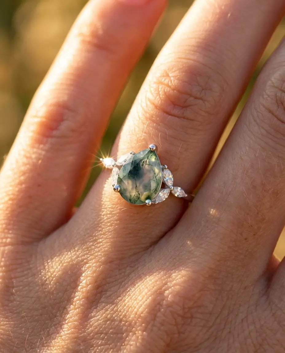 evoke the fresh beauty of morning dew on a forest floor with this exquisite Pear-Shaped Moss Agate Engagement Ring. The centrepiece is a lustrous 7x9mm teardrop moss agate, cradled by a trio of sparkling marquise-cut zircons on each side. These side stones are arranged like delicate leaves, guiding the eye to the central gem and creating a harmonious flow that celebrates the organic beauty of the natural world.