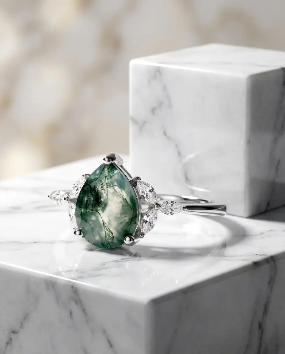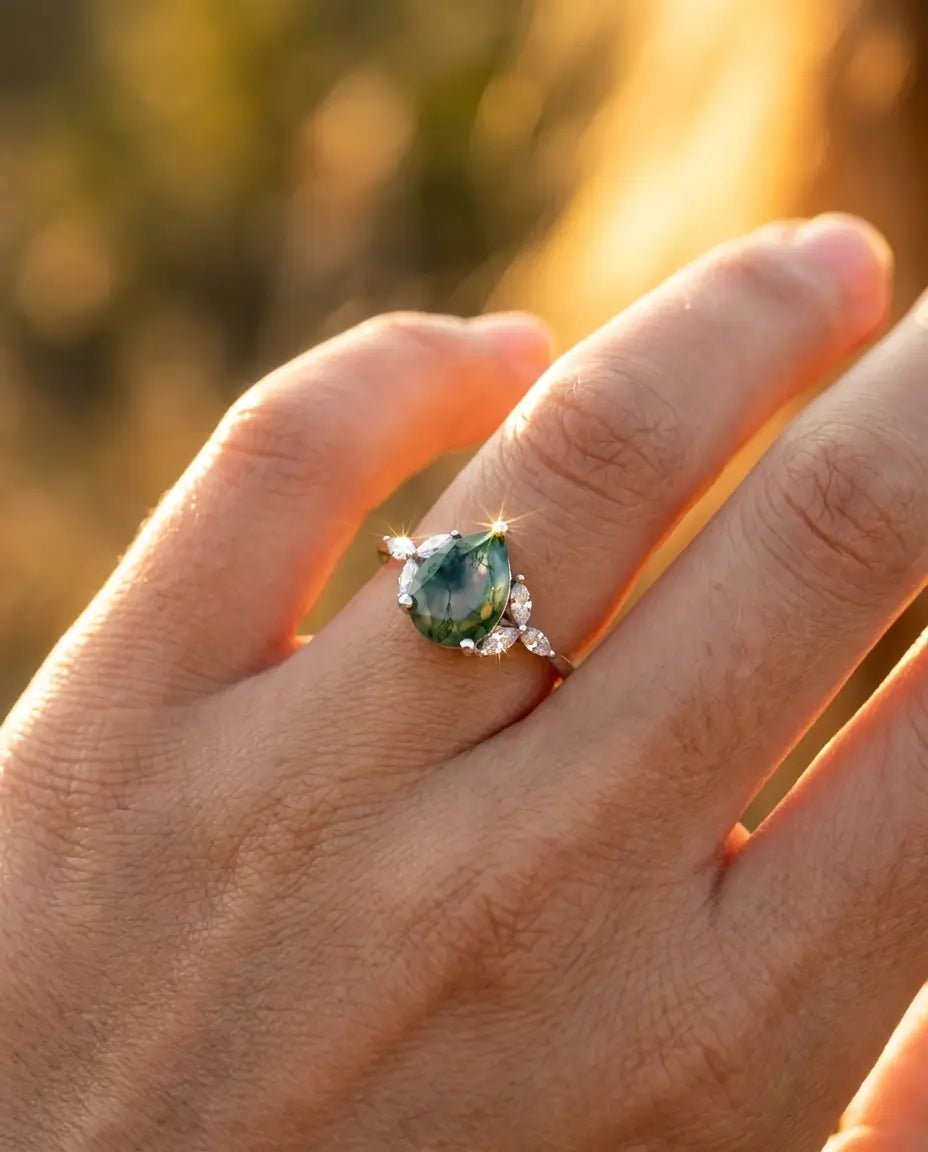 The pear cut is beloved for its ability to elongate the finger, creating a slender and elegant silhouette. Inside the stone, green mineral inclusions swirl like mist through a forest. Because these patterns are naturally formed, your ring is a one-of-a-kind masterpiece. To fully appreciate the depth of this gemstone, we invite you to discover the spiritual meaning and healing benefits of moss agate, a stone associated with refreshing the soul and seeing beauty in all things.