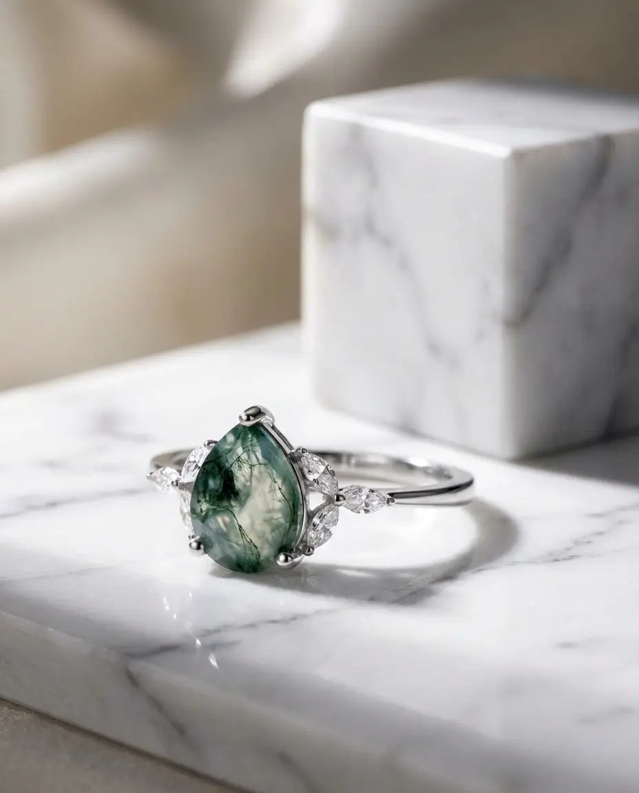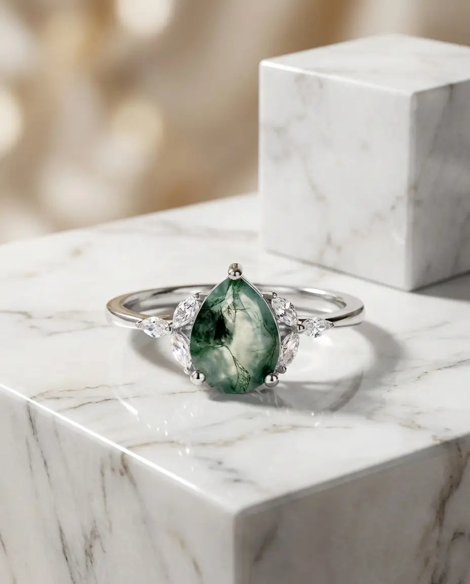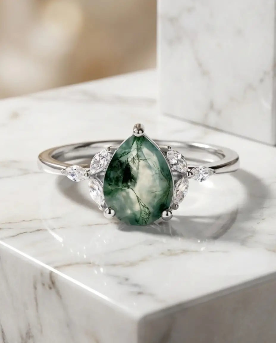 The cool tones of the sterling silver and the deep greens of the agate make this ring highly versatile. For a truly coordinated bridal or evening look, you can explore our selection of handcrafted moss agate necklaces to find a teardrop pendant that mirrors the shape of your ring.