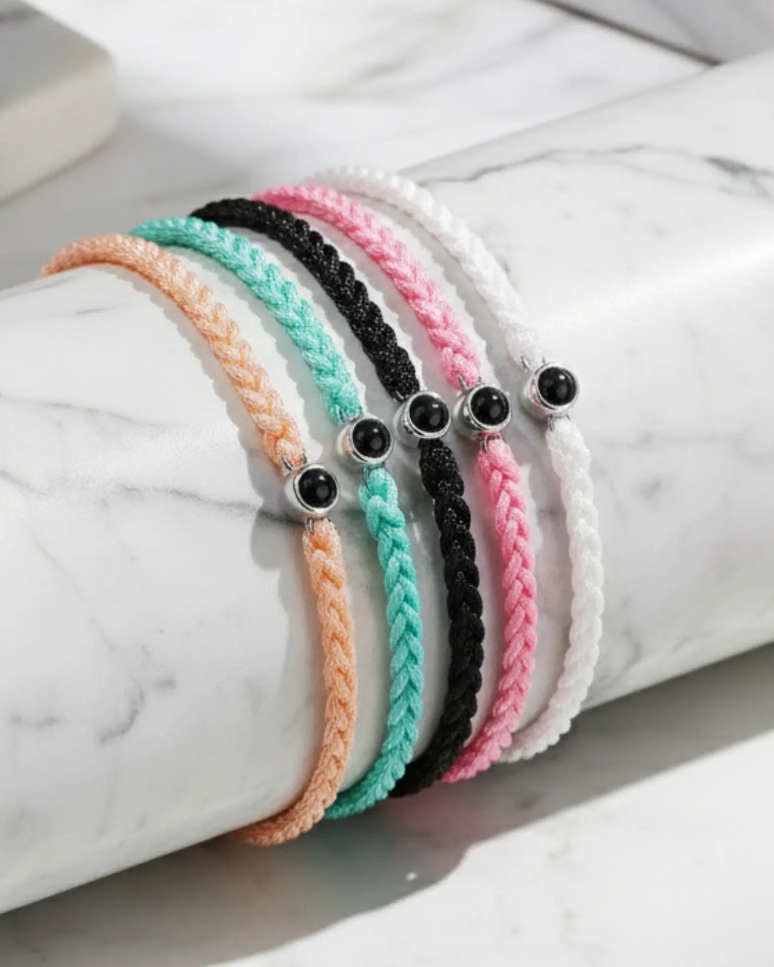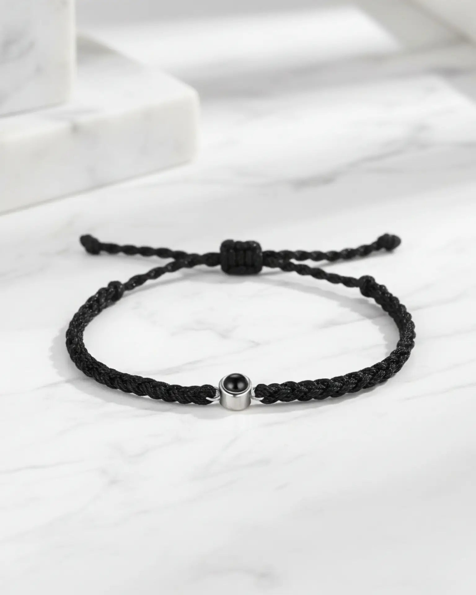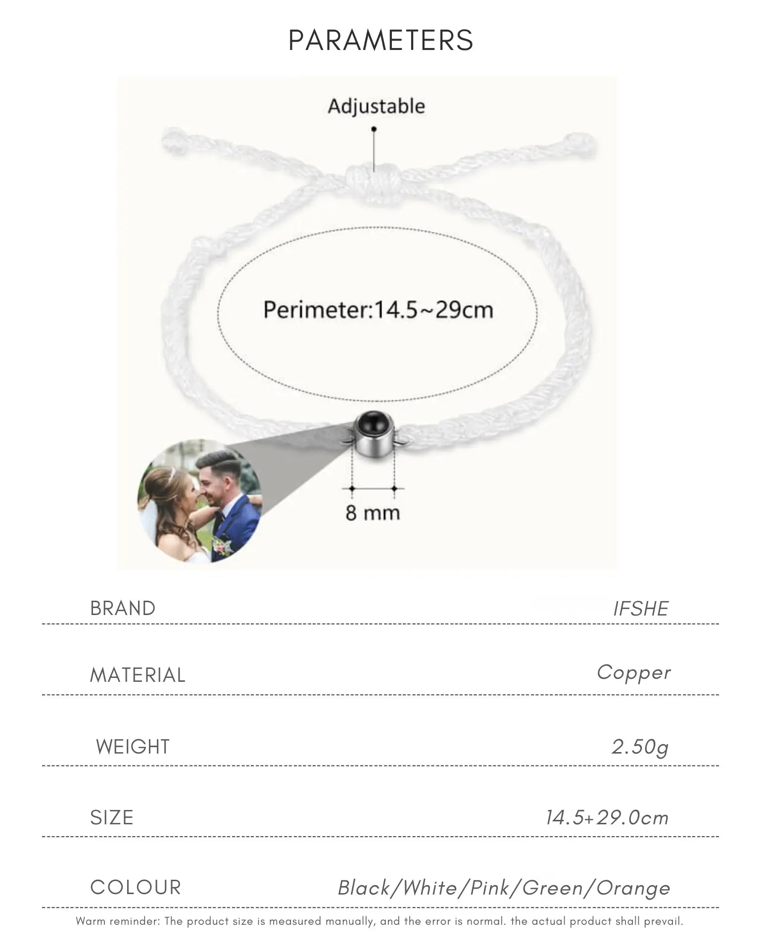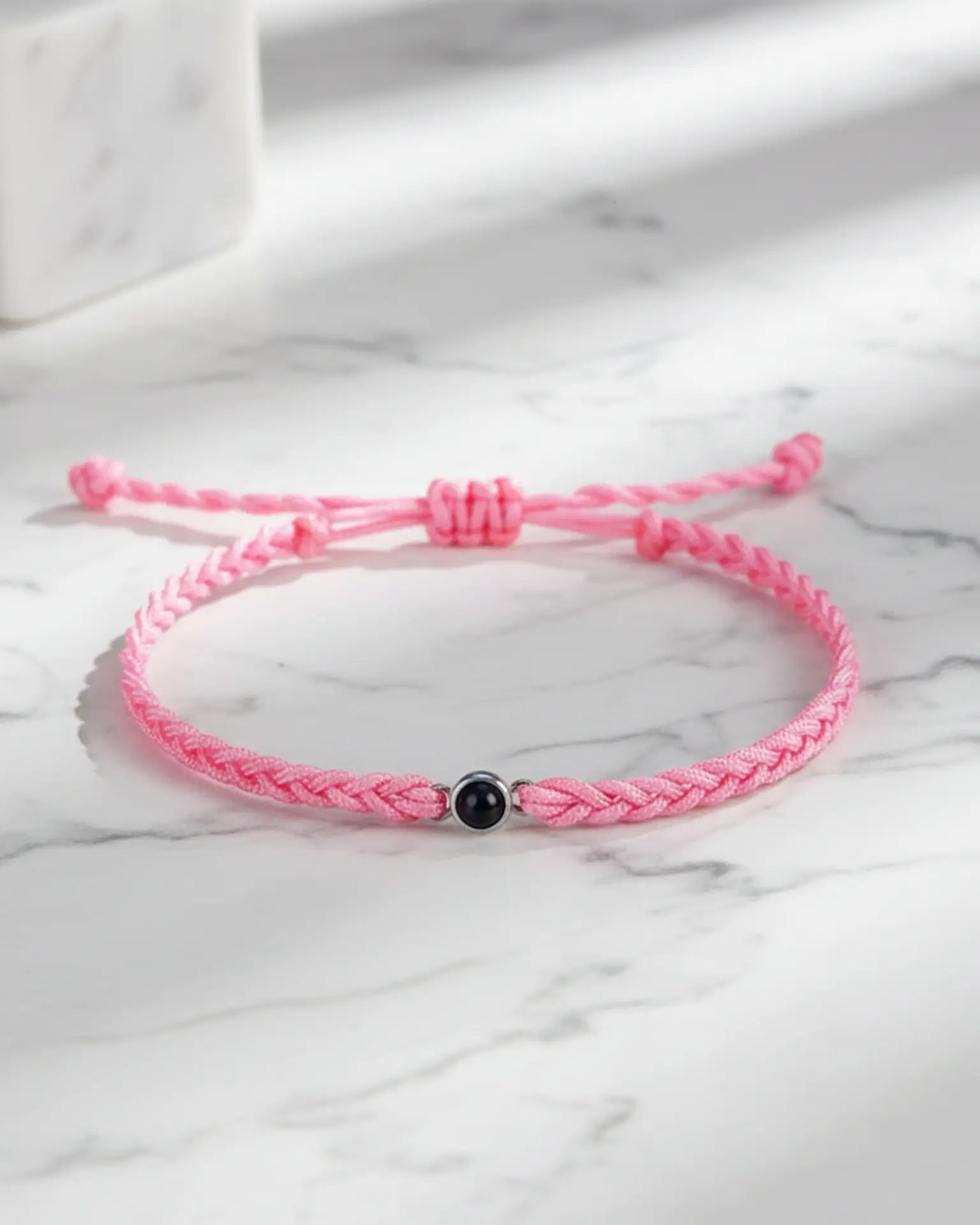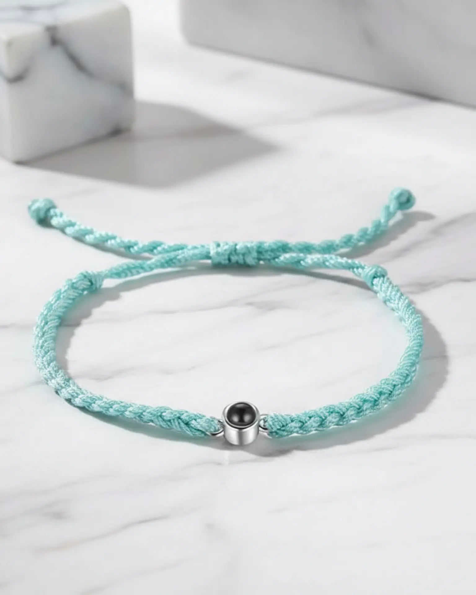 The bracelet features a comfortable, durable braided rope band in your choice of five vibrant colors. The central charm, crafted from a Copper base, holds the innovative micro-projection lens. The design is fully adjustable for a comfortable fit on any wrist, making it an ideal and affordable sentimental gift.