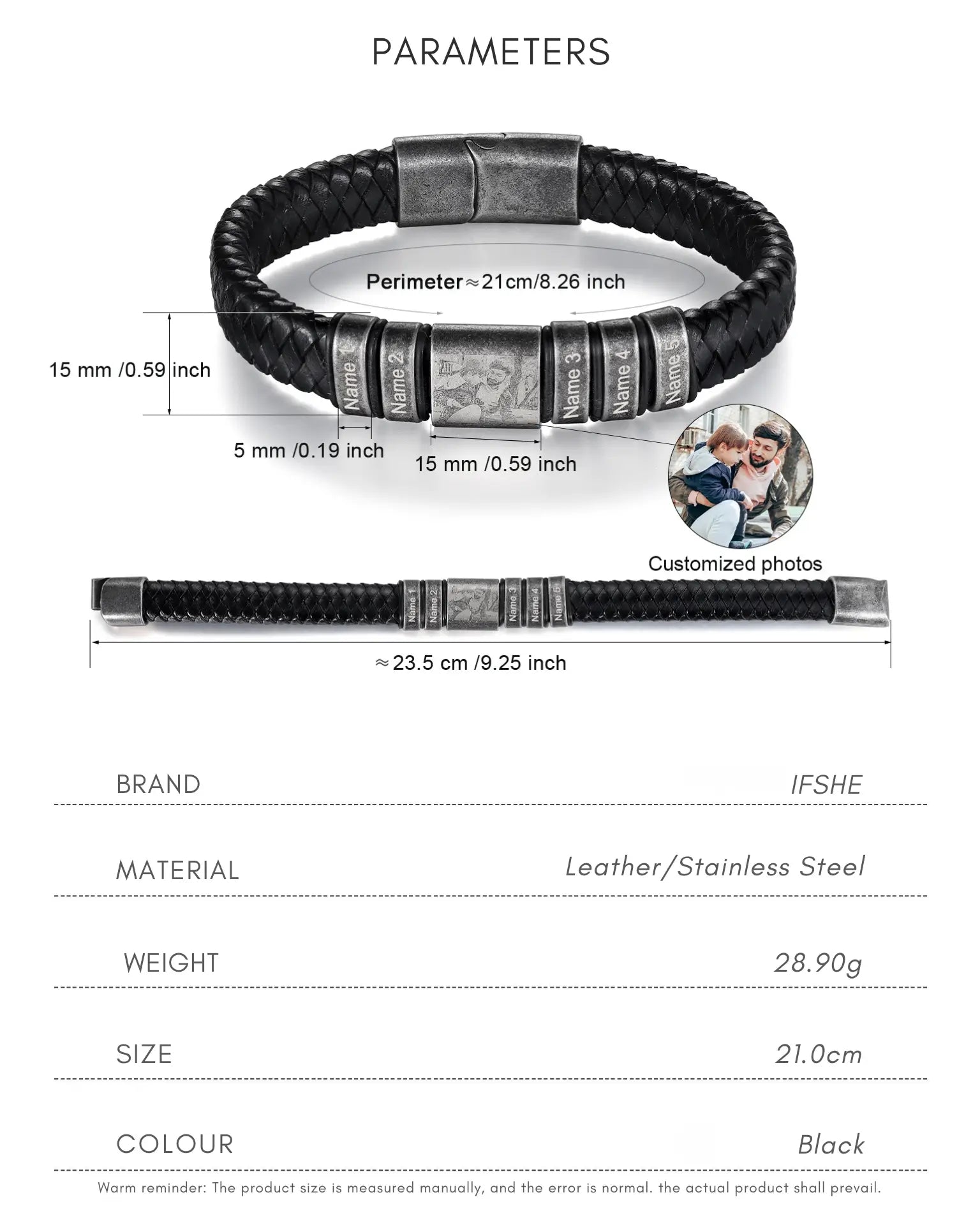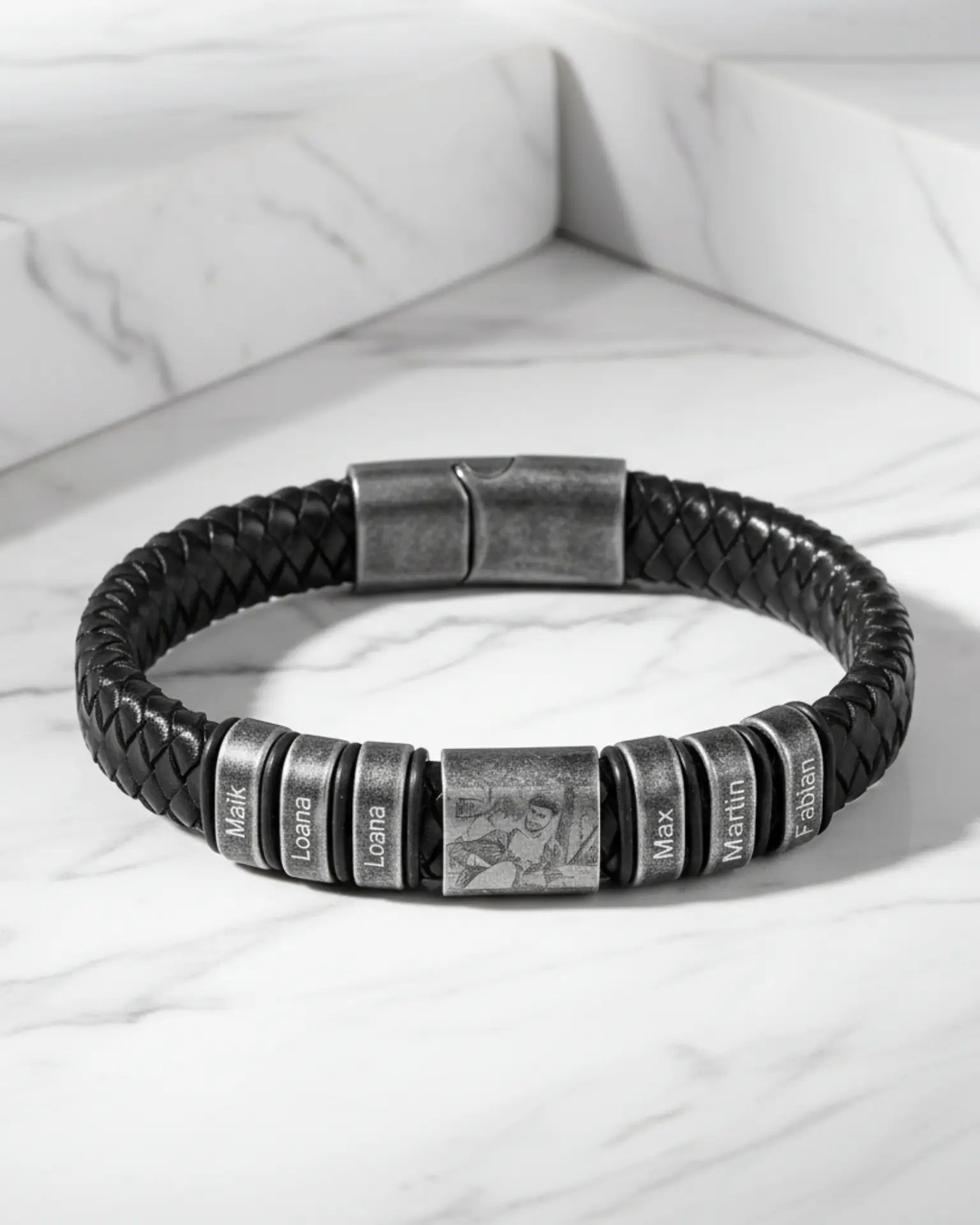 This piece offers triple personalisation: a central Photo Engraved plaque, surrounded by 2 to 5 custom name charms or beads. The rugged aesthetic is created by combining a thick, braided leather band with highly durable, tarnish-resistant Stainless Steel charms and a strong magnetic clasp, all finished in an attractive Retro tone. Its substantial weight (28.9g) and bold style make it an unforgettable gift for him.