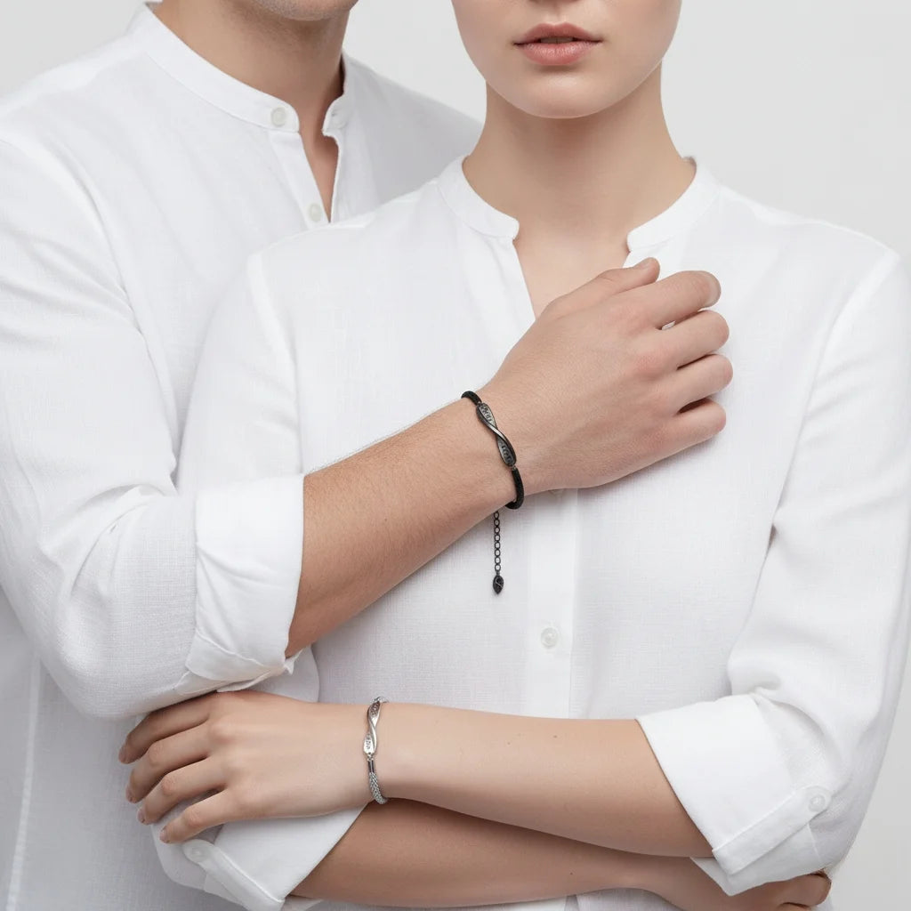Celebrate your bond with this stunning matching name bracelets set. Featuring a sleek engraved bar for two names or a special date, one silver chain and one black rope bracelet. The clever magnetic heart clasp pulls you closer. The perfect engraved relationship jewellery gift. Discover more of our beautiful couples bracelets.