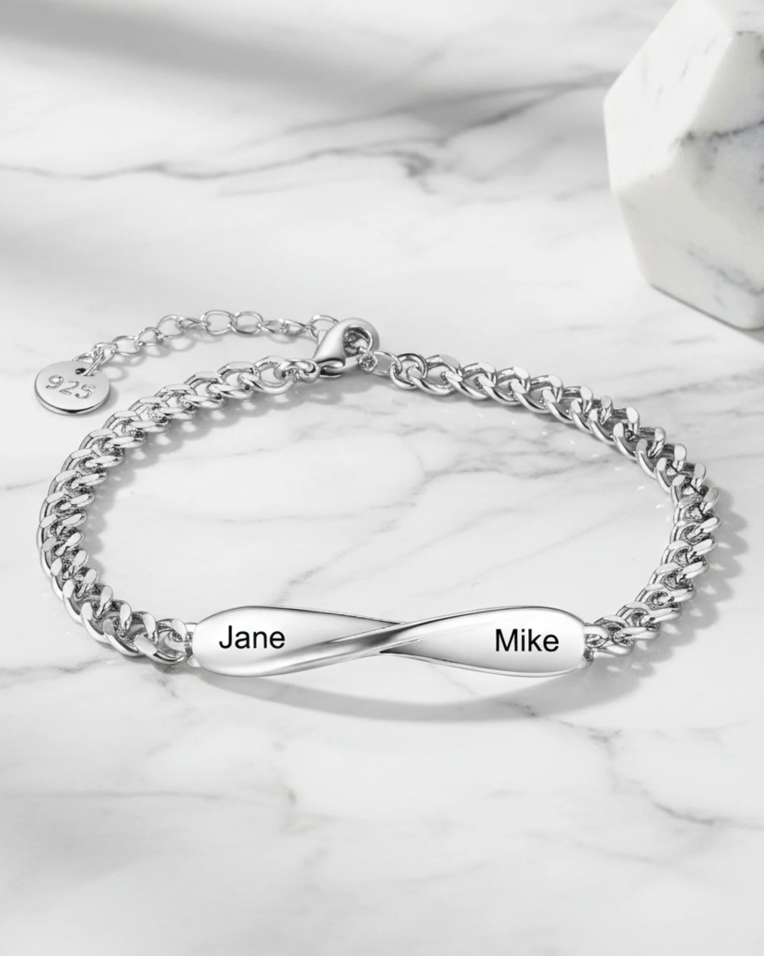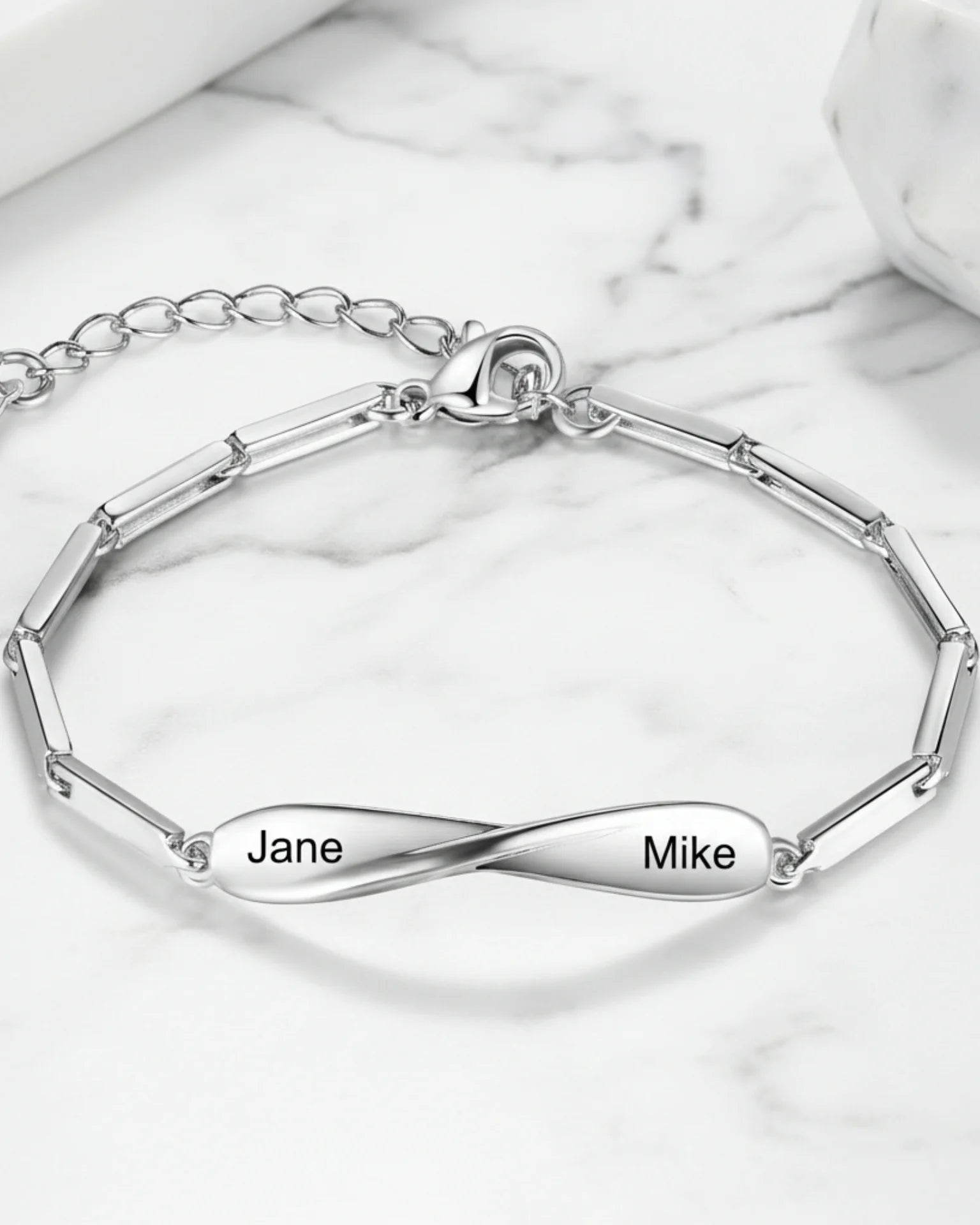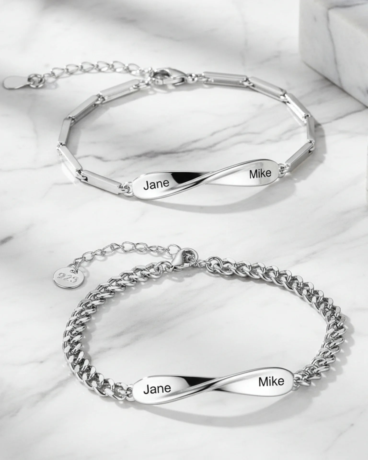 Celebrate your partnership and shared journey with our Infinite Bond Matching Couples Bracelets. This exquisite jewellery set is the ultimate symbol of inseparable unity and eternal love. Each bracelet features a central nameplate designed with a smooth, infinity twist, elegantly merging two personalised names or a significant date.