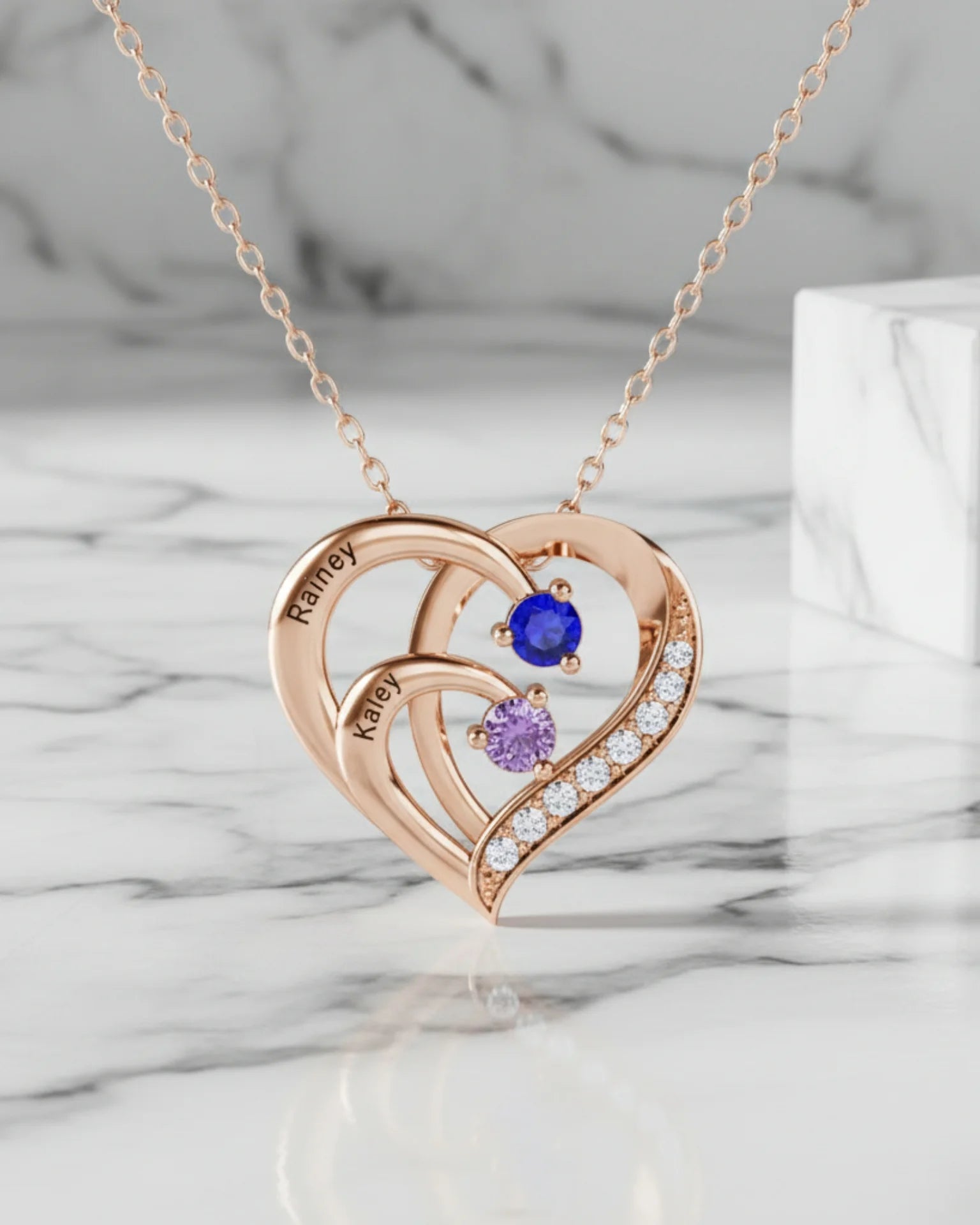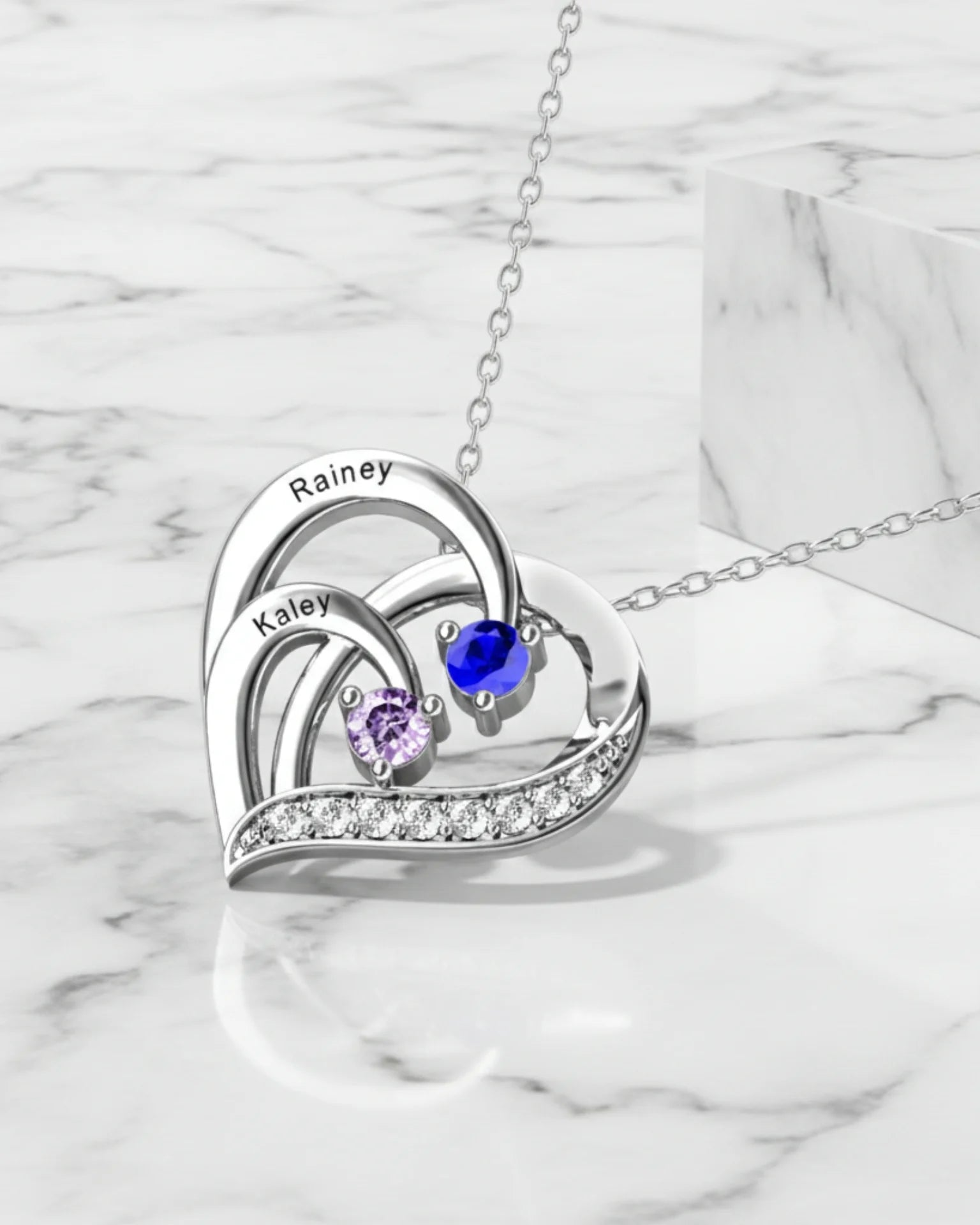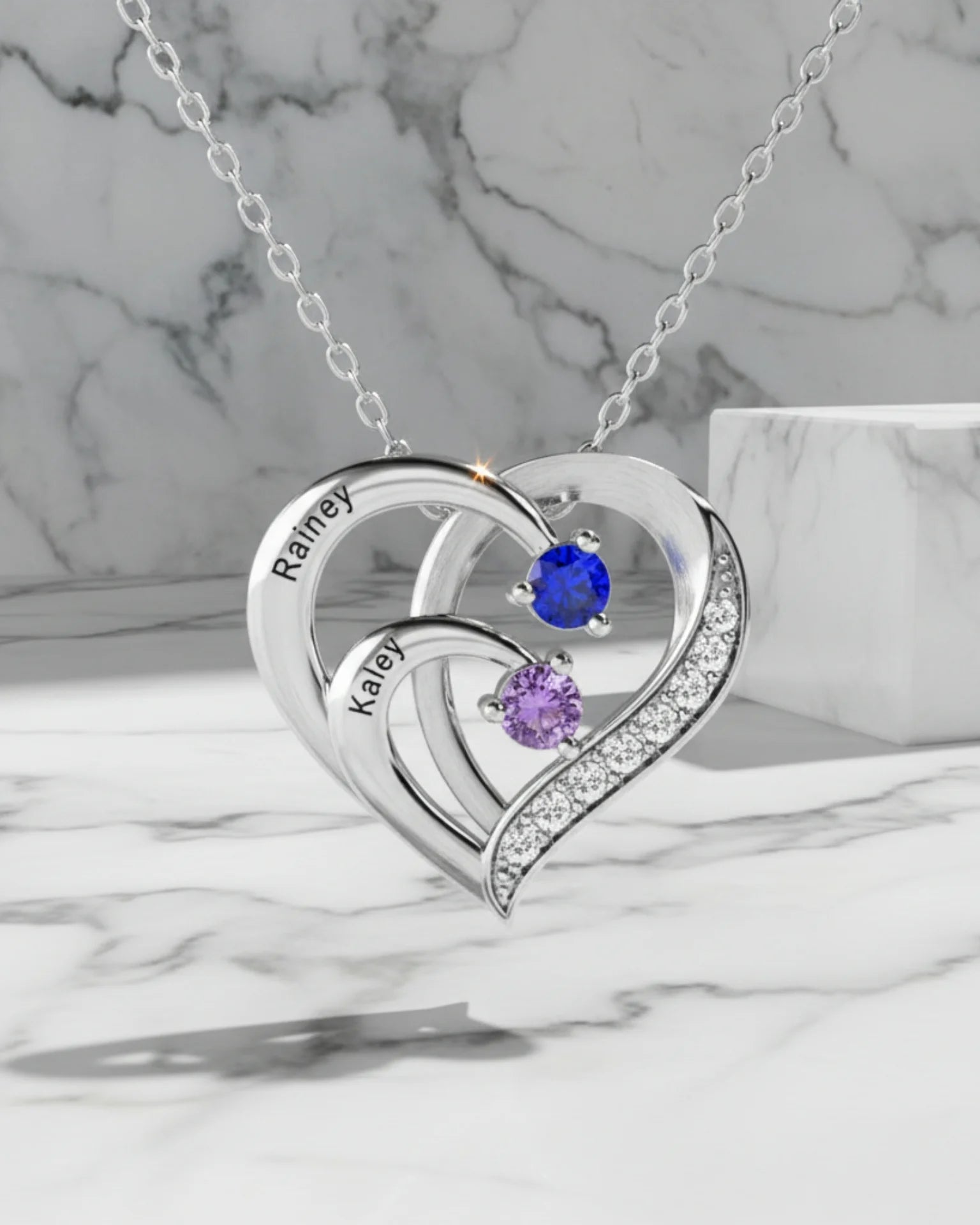 Celebrate your unique bond with our exquisite Personalised Engraved Name Heart Necklace. Crafted from genuine 925 sterling silver, this stunning piece features two intertwined hearts, each custom engraved with a name of your choice. Two dazzling birthstones add a pop of colour and personal touch, making it a truly meaningful keepsake.