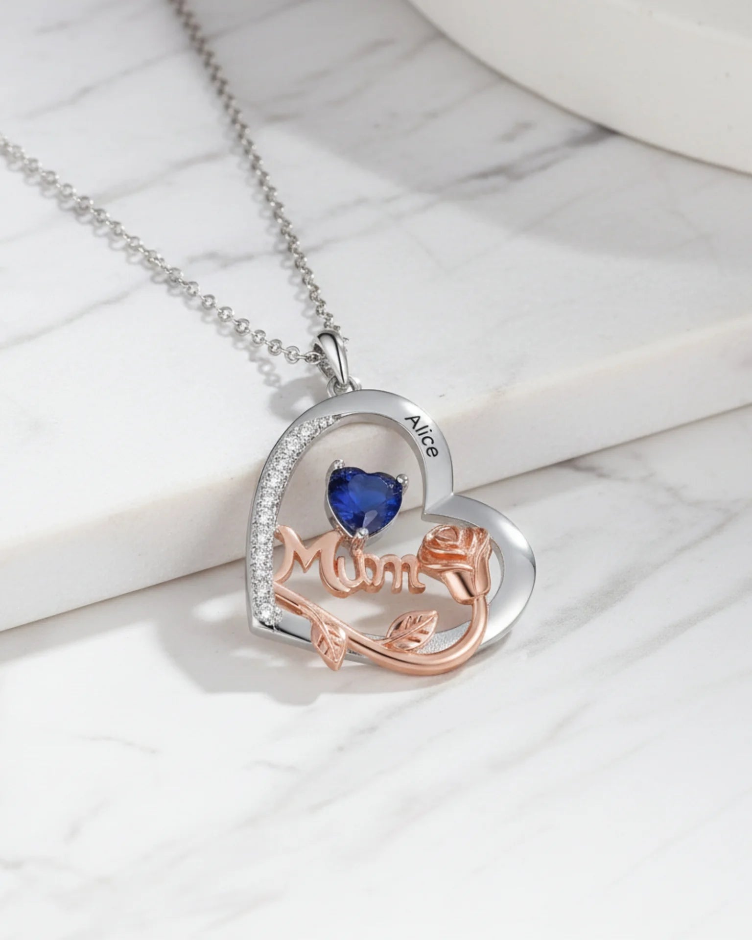 Celebrate the special women in your life with this stunning personalised necklace for Mum. This exquisite piece features a shimmering heart pendant, elegantly combining copper with sparkling accents. Engrave up to four names and select a matching birthstone necklace for each loved one, making it a truly unique and sentimental gift. The design incorporates a beautiful rose motif, symbolizing enduring love and appreciation. Perfect for Mother's Day, birthdays, or just because. A beautiful, lasting token of family connection she'll cherish forever.