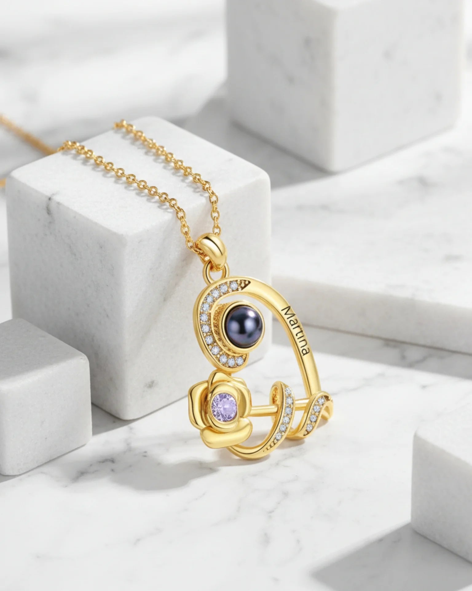 Personalised Heart Rose Photo Projection Necklace with Name Engraving & Birthstone
