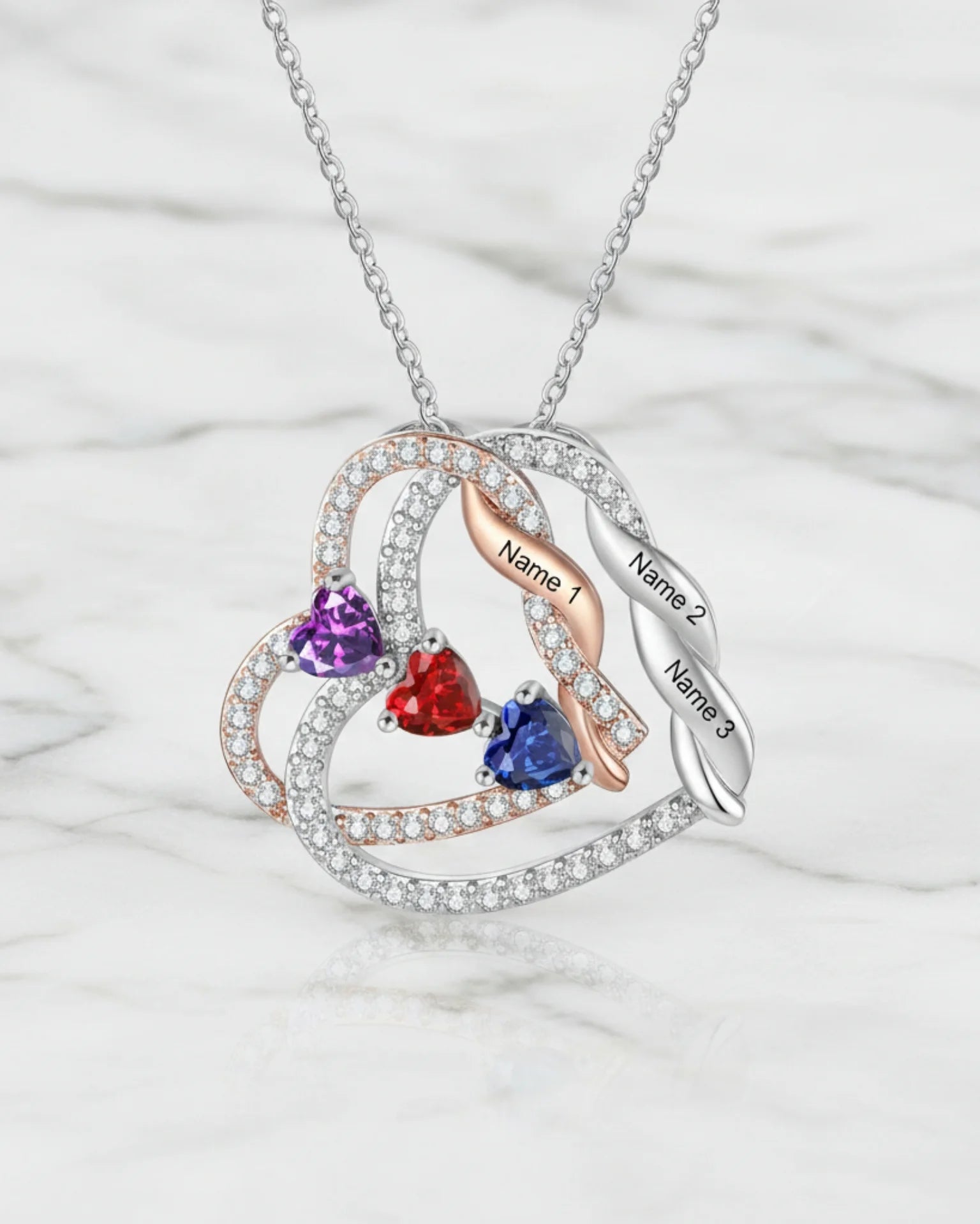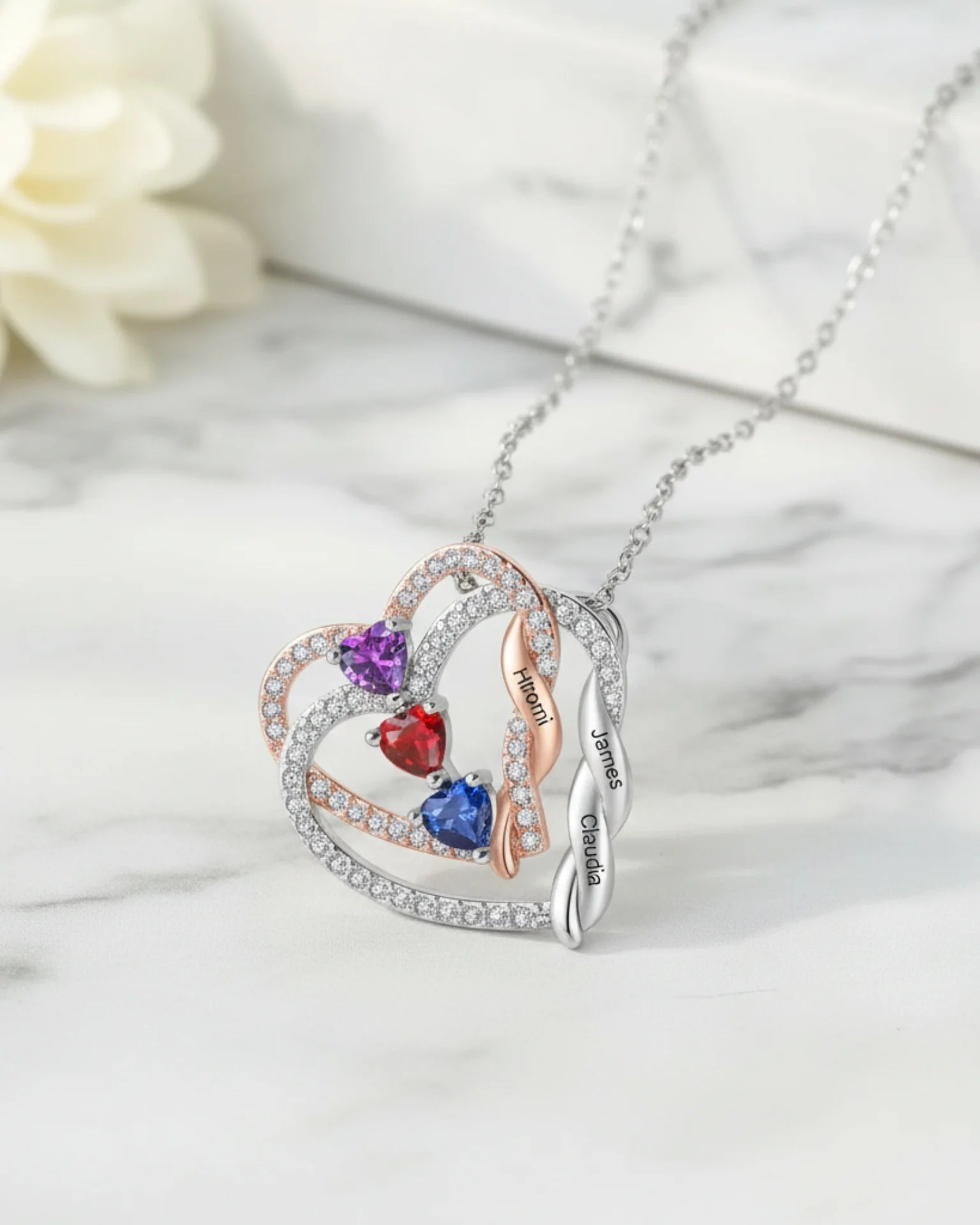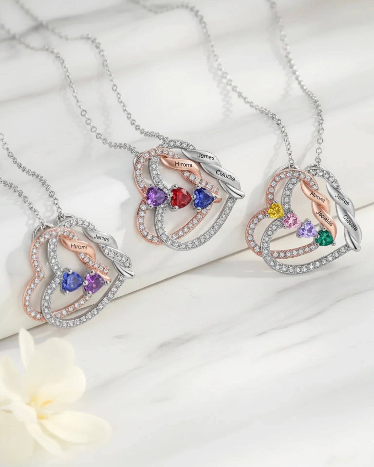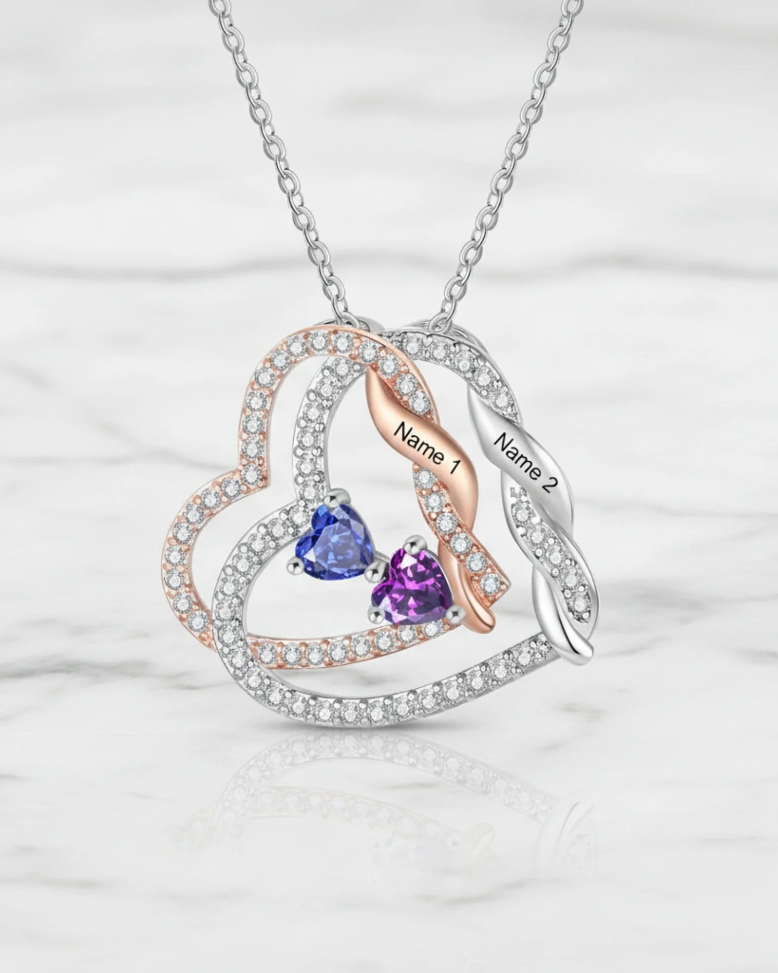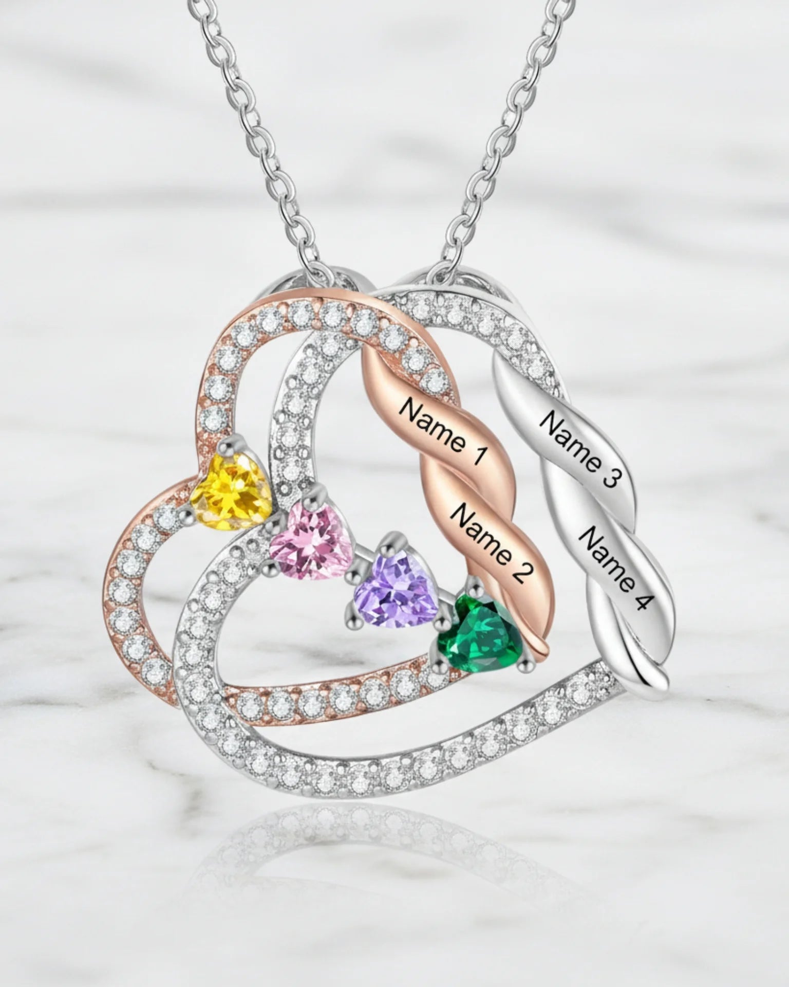Celebrate your loved ones with our exquisite Intertwined Hearts Necklace. This beautifully crafted piece features a dazzling double heart design, customisable with 2-4 engraved names and their corresponding birthstones. Made from elegant copper with a delicate chain, it's a timeless symbol of connection and affection, perfect for showcasing your family or special relationships. A truly unique and heartfelt gift that will be cherished forever.
