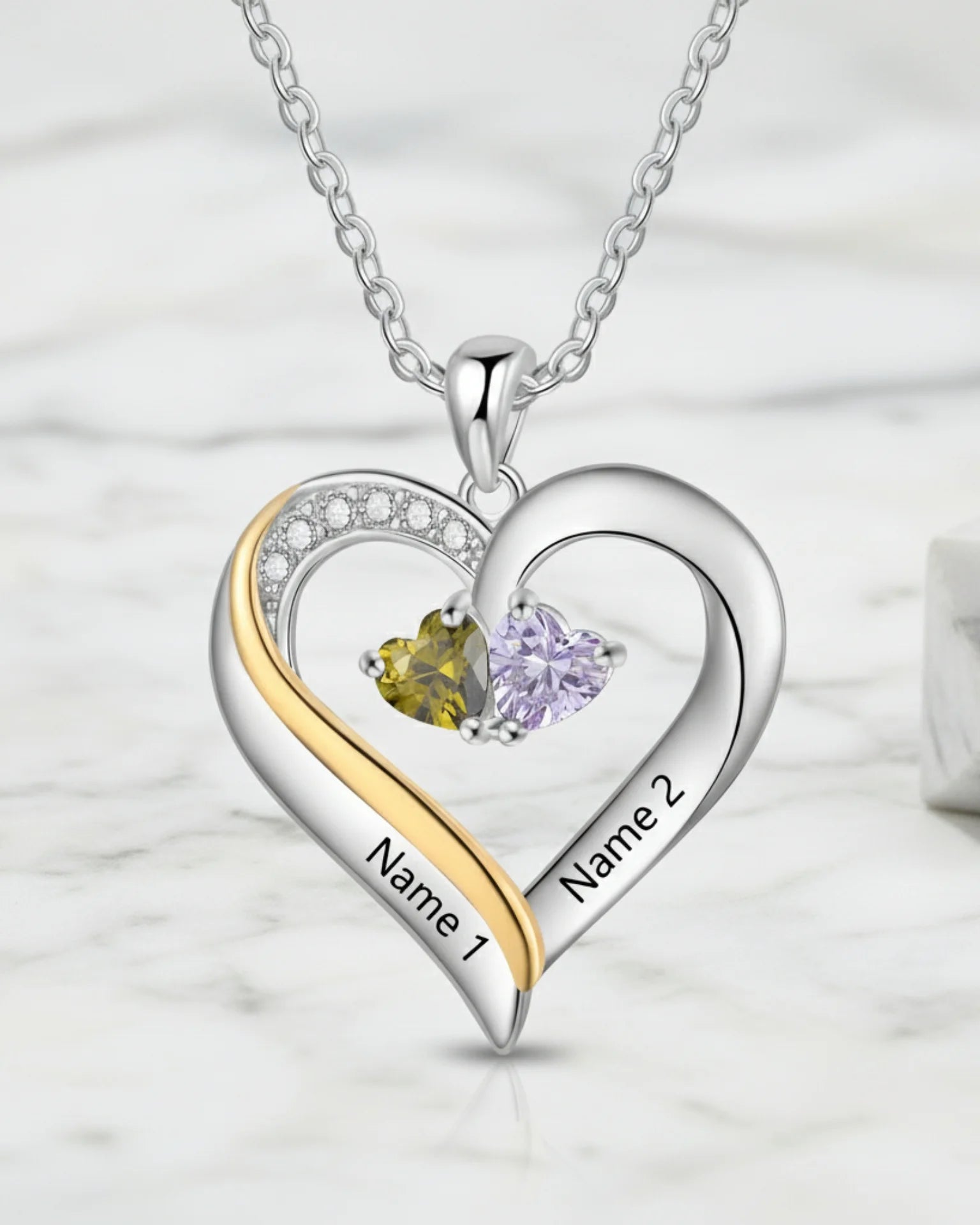 This elegant .925 sterling silver heart necklace is fully personalised with two names and two heart-shaped birthstones. A perfect, meaningful engraved keepsake. Features a delicate chain and a partially gold-plated accent.