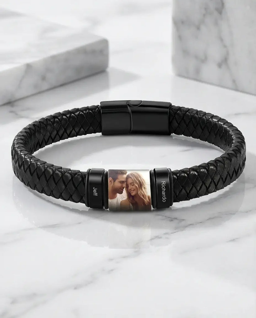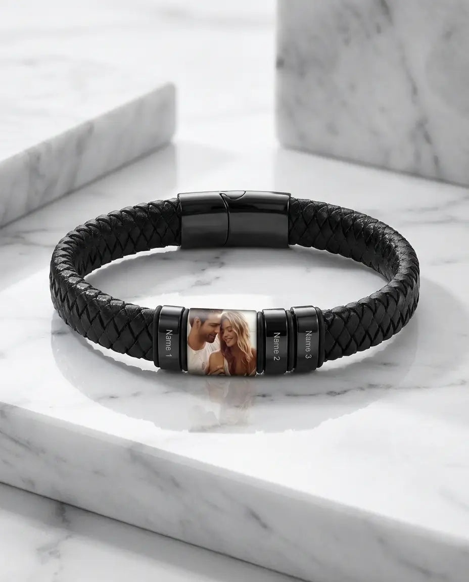 Men's Personalised Photo Bracelet - Braided Leather with Engraved Family Names