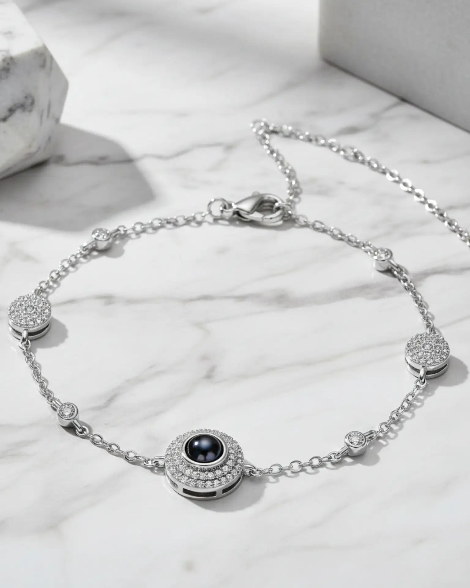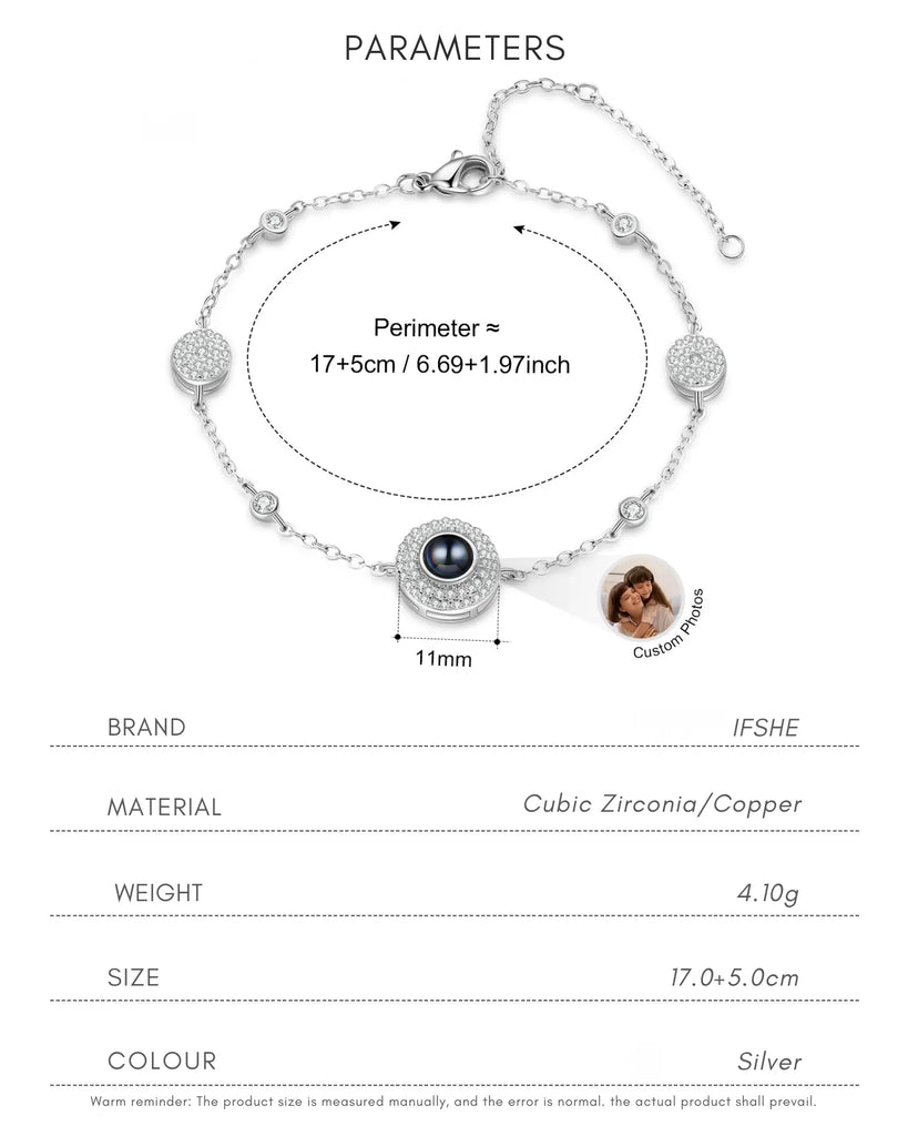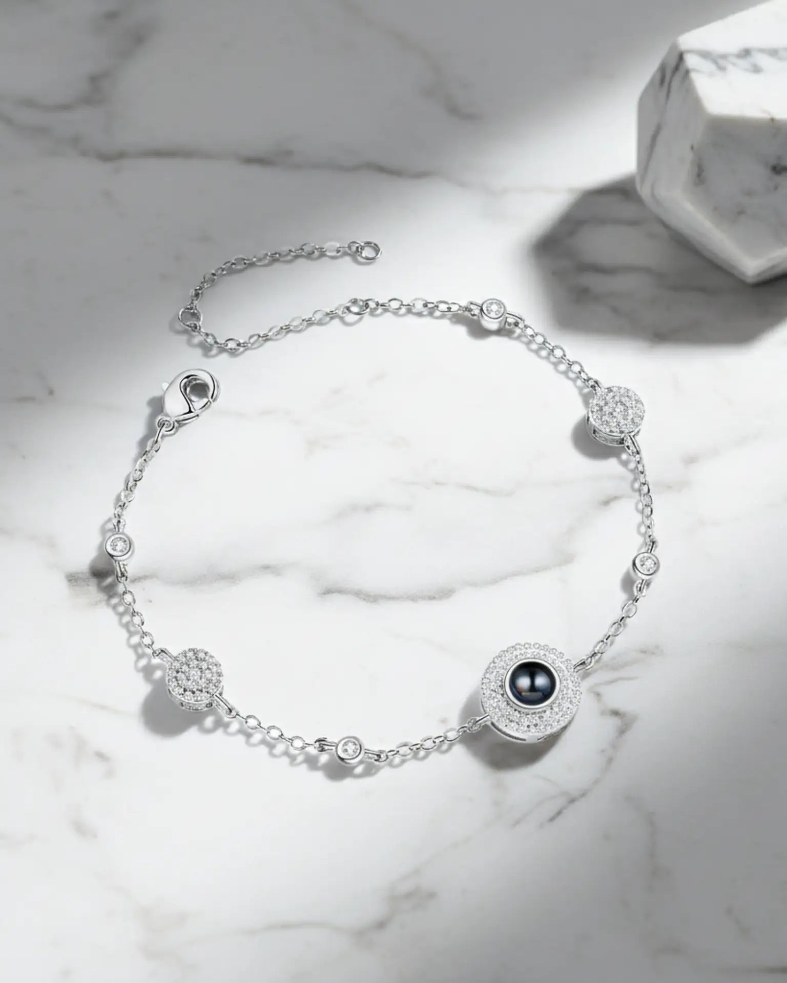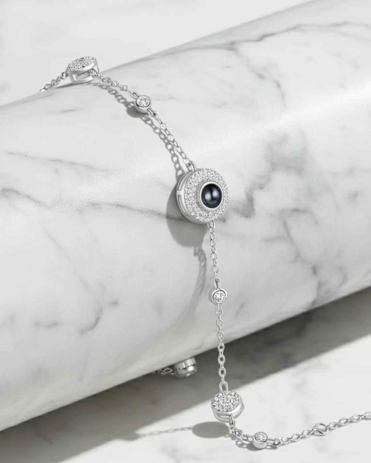 Discover the beauty of subtle sentiment with our Secret Gem Photo Projection Station Bracelet. This elegant piece of jewellery features a delicate chain accented with sparkling, bezel-set simulated diamonds (CZs), creating a refined 'diamond-by-the-yard' aesthetic. It is a subtle yet profound expression of treasured secrets and lasting affection.