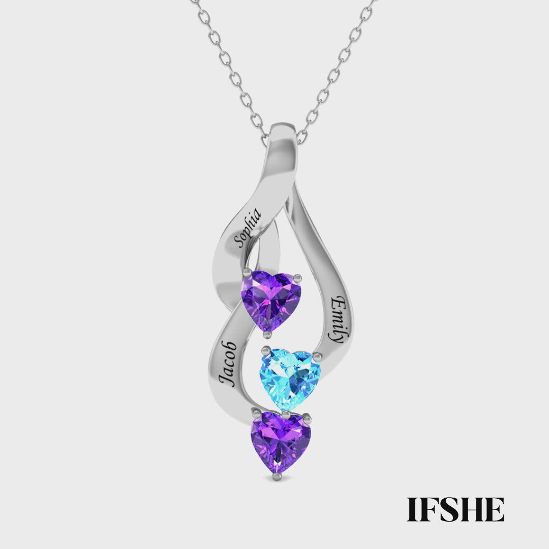 Celebrate the most important woman in your life with this exquisite personalised gift for Mum. Crafted from high-quality 925 sterling silver, this elegant pendant features three cascading heart-shaped birthstones, each personalised with the name of a loved one. The intertwined, contemporary design symbolises the unbreakable bond of family. It’s a cherished, sentimental keepsake perfect for Mother's Day, her birthday, or simply as an expression of enduring love. A unique piece of jewellery she’ll wear close to her heart every day.