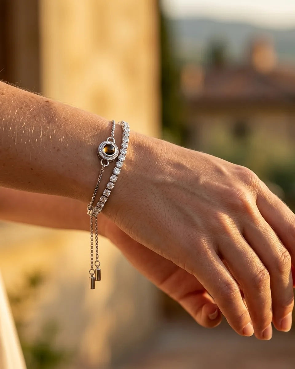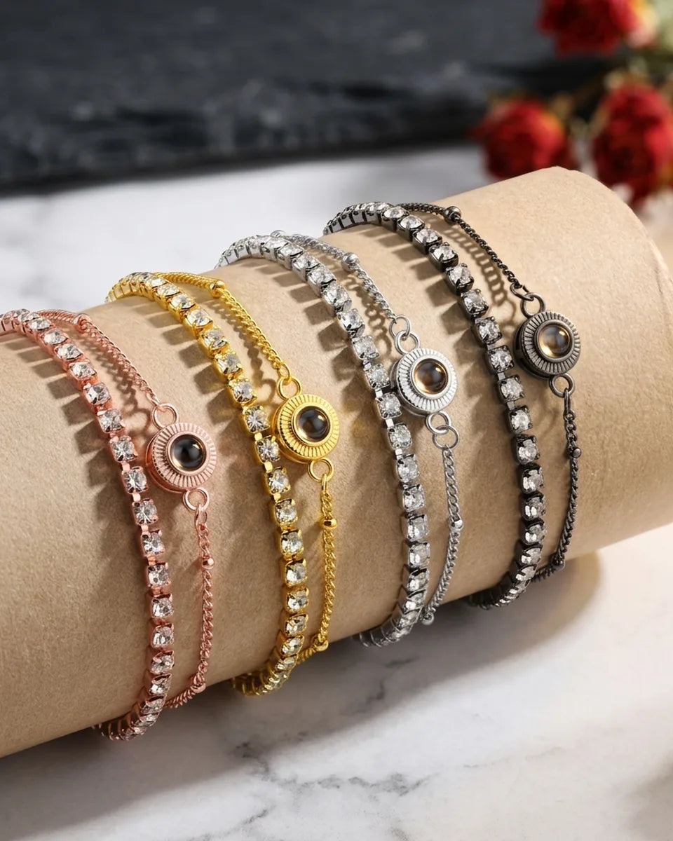 Keep your most treasured moments at the centre of your everyday style with our elegant double-layered photo projection bracelet. Designed to carry a hidden, custom image of your loved ones, pets, or fondest memories, this exquisite piece of personalised jewellery transforms a beautiful accessory into an intimate keepsake. Whether you are treating yourself or searching for a truly unforgettable gift, this sparkling bracelet ensures your favourite memories are never far away.