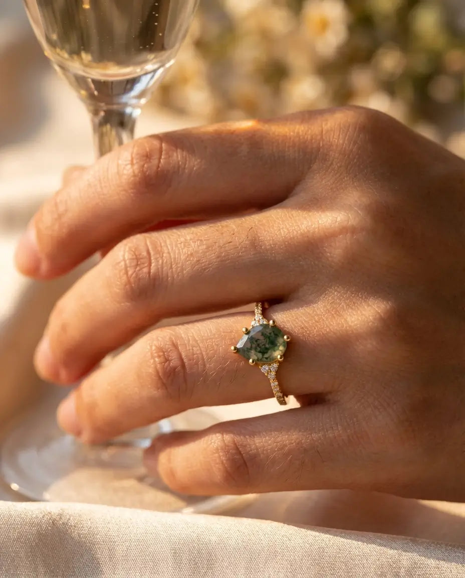 No two moss agate stones are ever alike. The translucent body of the gem reveals intricate green mineral inclusions that resemble fern fronds or misty forests. This means your ring is a truly personal talisman. To better understand the symbolism behind this gem, we invite you to explore the spiritual significance and healing properties of moss agate, a stone often associated with emotional healing and new beginnings.
