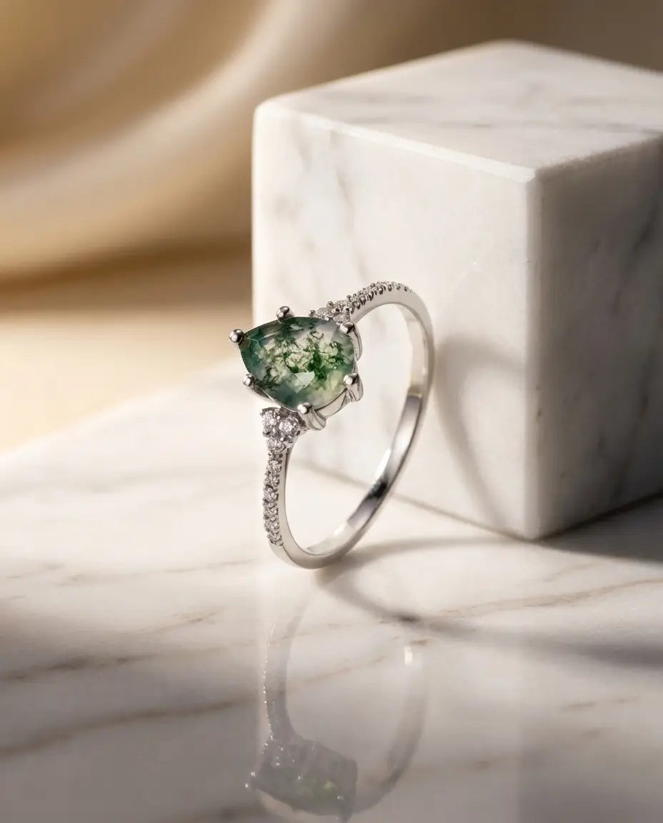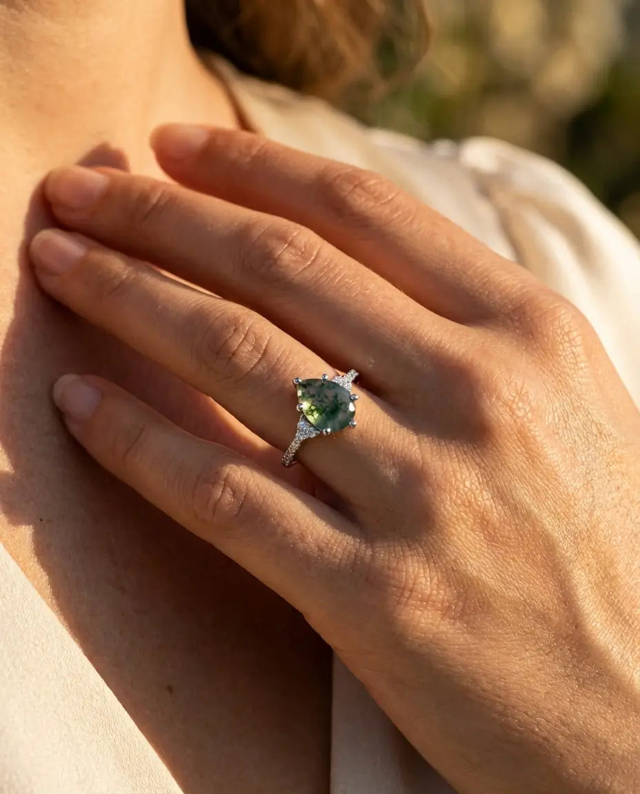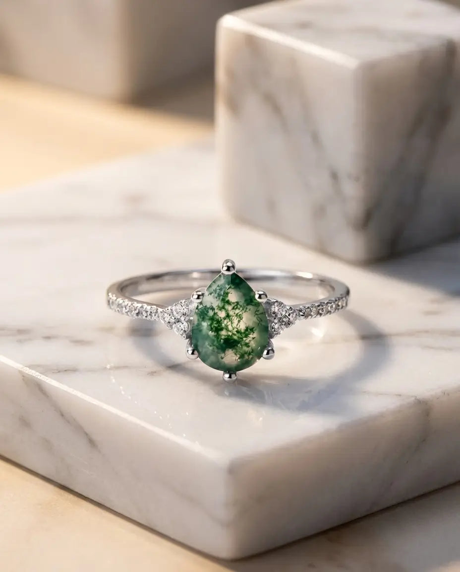 Embrace the subtle beauty of the wild with this exquisite Pear-Shaped Moss Agate Ring. The centrepiece is a 6x8mm teardrop moss agate, a shape celebrated for its ability to elongate and flatter the finger. It is flanked by a delicate cluster of three round zircons on each shoulder, leading into a shimmering pavé-set band. This design creates a seamless flow of light that draws the eye directly to the unique green landscapes within the central stone.