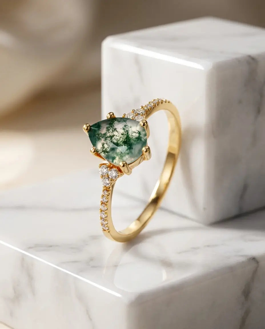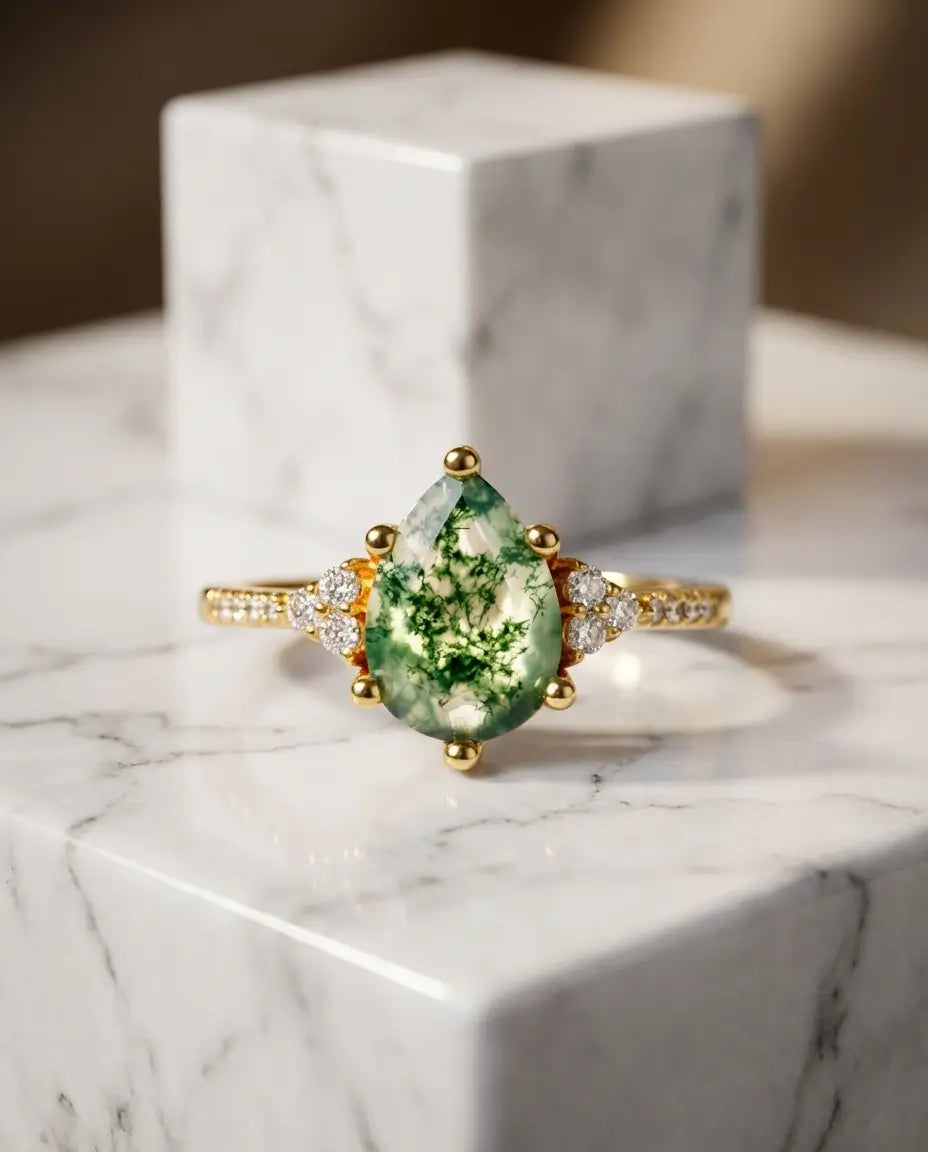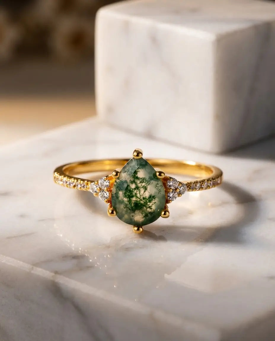 Pear-Shaped Moss Agate Ring - Pave Shoulder Teardrop Design in Silver or Gold