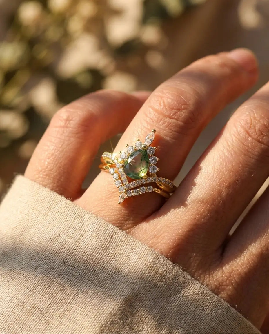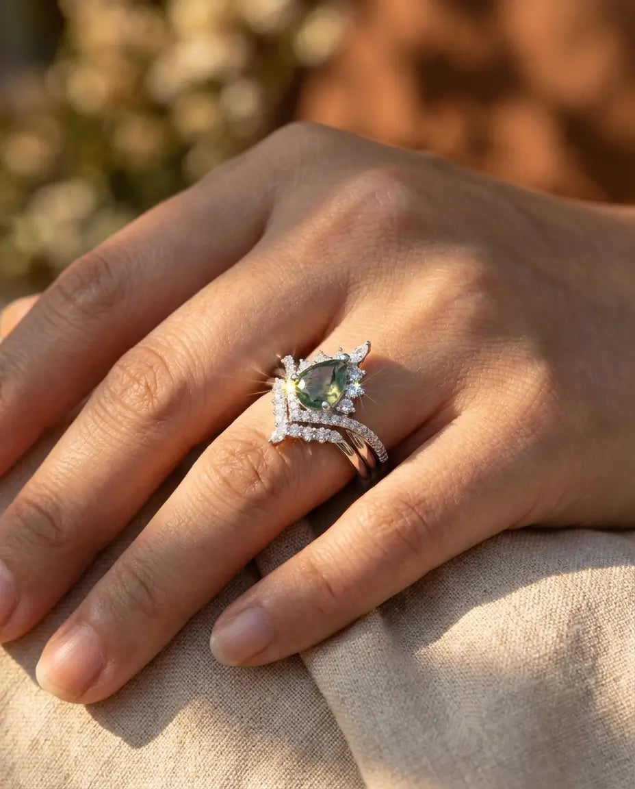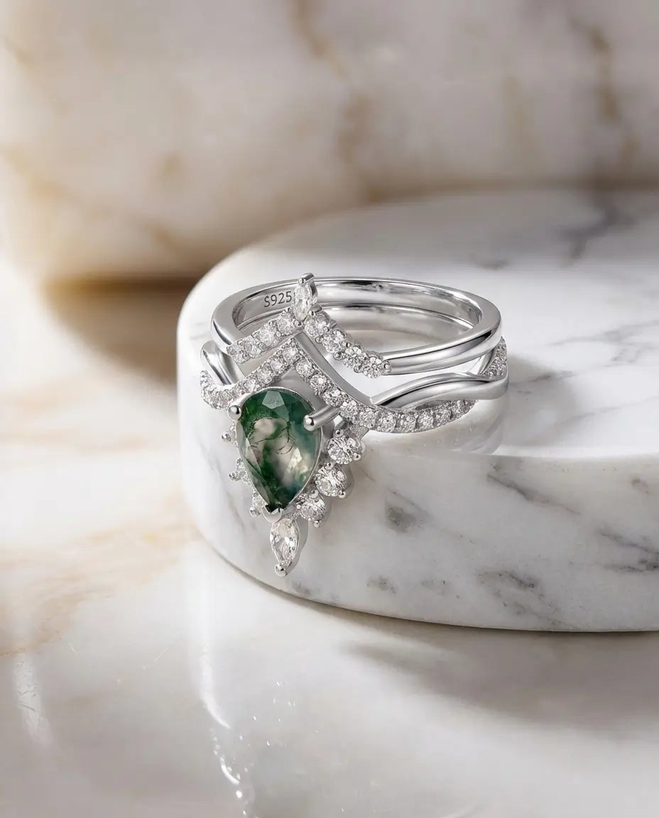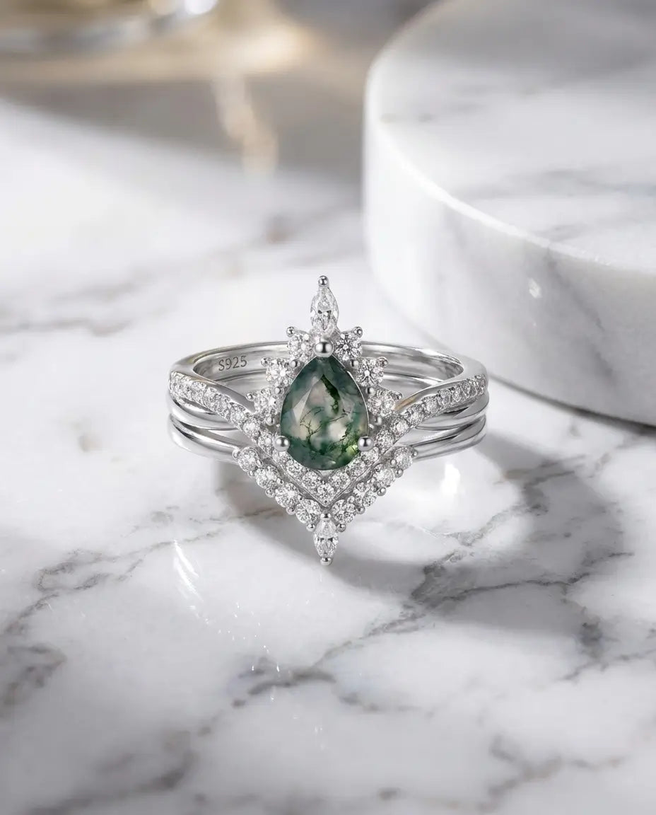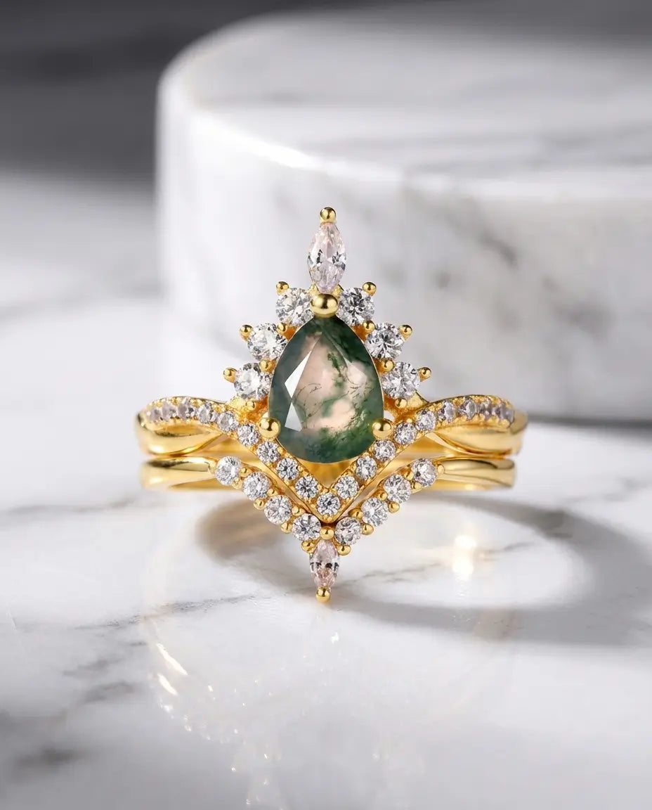 Embrace the romance of a bygone era with this breathtaking Vintage Pear Moss Agate Bridal Set. The engagement ring features a lush 6x8mm pear-shaped moss agate, surrounded by a radiant "sunburst" halo of marquise and round zircons that crown the top of the gem. Paired with a matching curved wedding band that nests perfectly beneath, the complete stack creates a magnificent tiara silhouette on your finger, blending regal elegance with the organic beauty of the wild.
