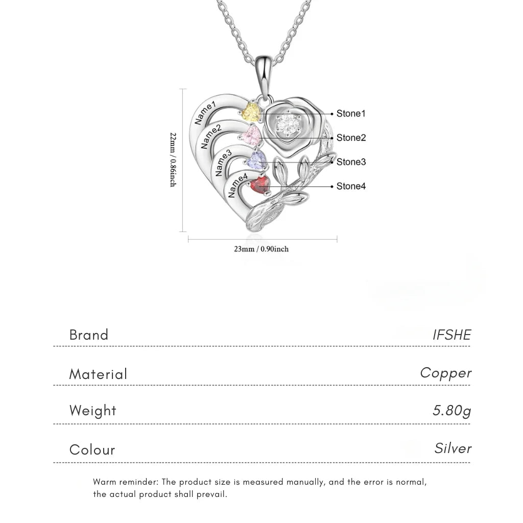 Celebrate your precious family ties with this exquisite personalised heart necklace. Featuring a delicate rose and vine design, this piece can be customised with 1 to 4 engraved names and their corresponding birthstones. It's the perfect custom gift for Mum or Nan (Grandma) to keep her loved ones close to her heart. Mark Mother's Day or any special occasion with a unique, thoughtful, and high-quality keepsake that she will treasure forever.